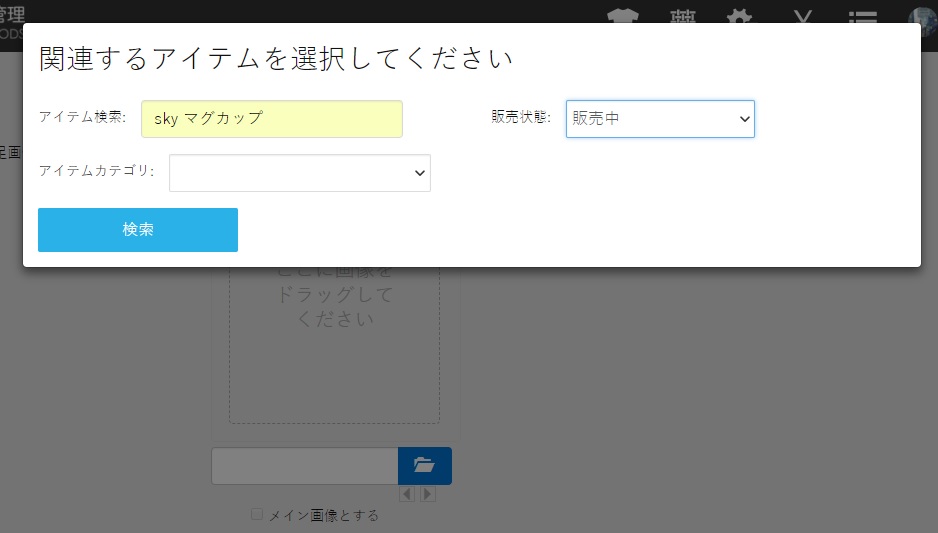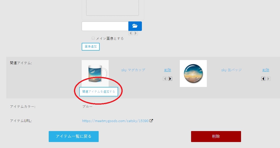 販売しているアイテムに、同じデザインなどで制作された別アイテムを、「関連アイテム」として登録することができます。